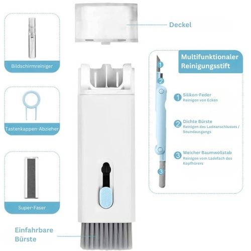 Sorgen Sie dafür, dass Ihre elektronischen Geräte immer in Top-Zustand sind, indem Sie das 7-in-1-Multifunktions-Reinigungsset in Ihre Reinigungsroutine integrieren. Genießen Sie ein sauberes und angenehmes Benutzererlebnis und verlängern Sie die Lebensdauer Ihrer elektronischen Geräte mit diesem praktischen Reinigungsset.